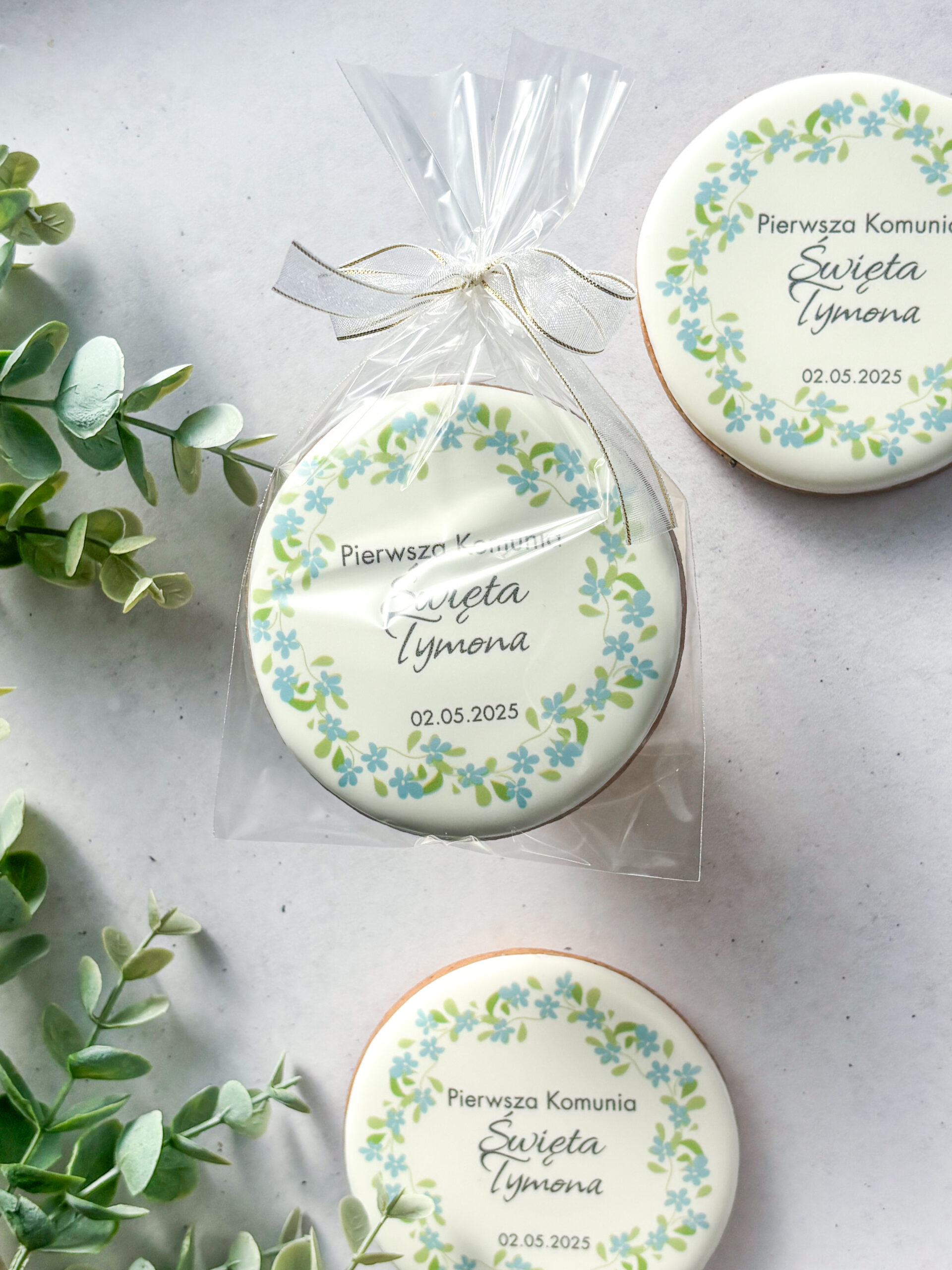 Elegancki personalizowany piernik w kształcie koła z delikatnym niebieskim wiankiem kwiatowym, idealny na Pierwszą Komunię Świętą lub Chrzest. Imię dziecka i data uroczystości nadają mu wyjątkowy, pamiątkowy charakter. Każdy piernik pakowany jest osobno w woreczek celofanowy przewiązany wstążką.