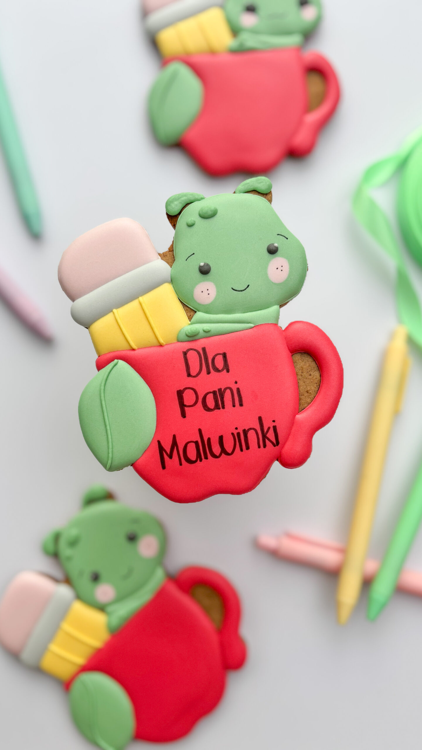 Ręcznie dekorowany piernik w kształcie czerwonego kubka z uroczym robaczkiem i ołówkiem – z możliwością dodania imienia nauczyciela, np. „Dla Pani Malwinki”.