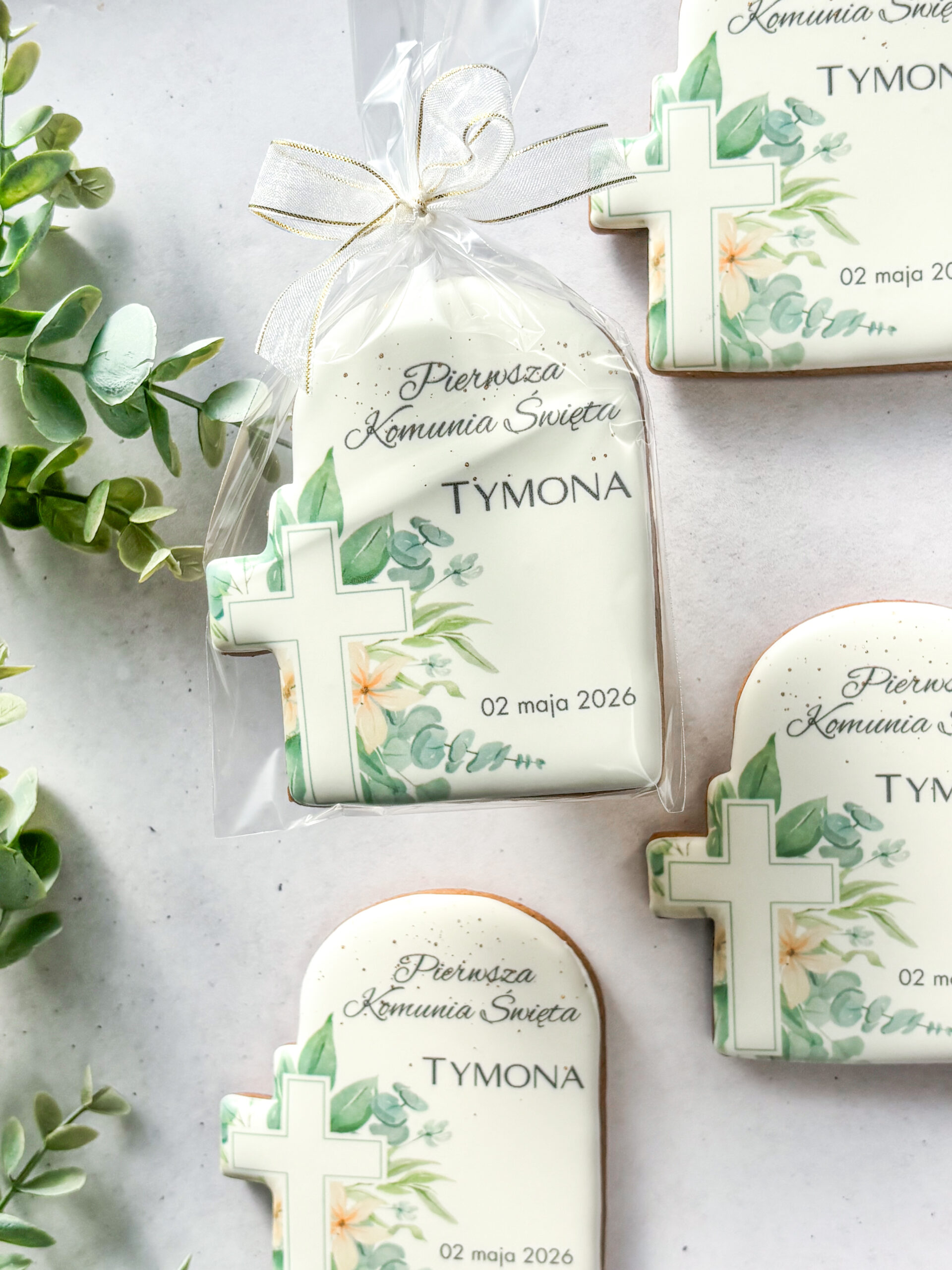 Elegancki personalizowany piernik z motywem krzyżyka, przygotowany na Pierwszą Komunię Świętą lub Chrzciny. Delikatna roślinna dekoracja, imię dziecka i data uroczystości tworzą wyjątkową słodką pamiątkę. Każdy piernik pakowany jest osobno w woreczek celofanowy przewiązany wstążką, dzięki czemu idealnie sprawdza się jako upominek dla gości.