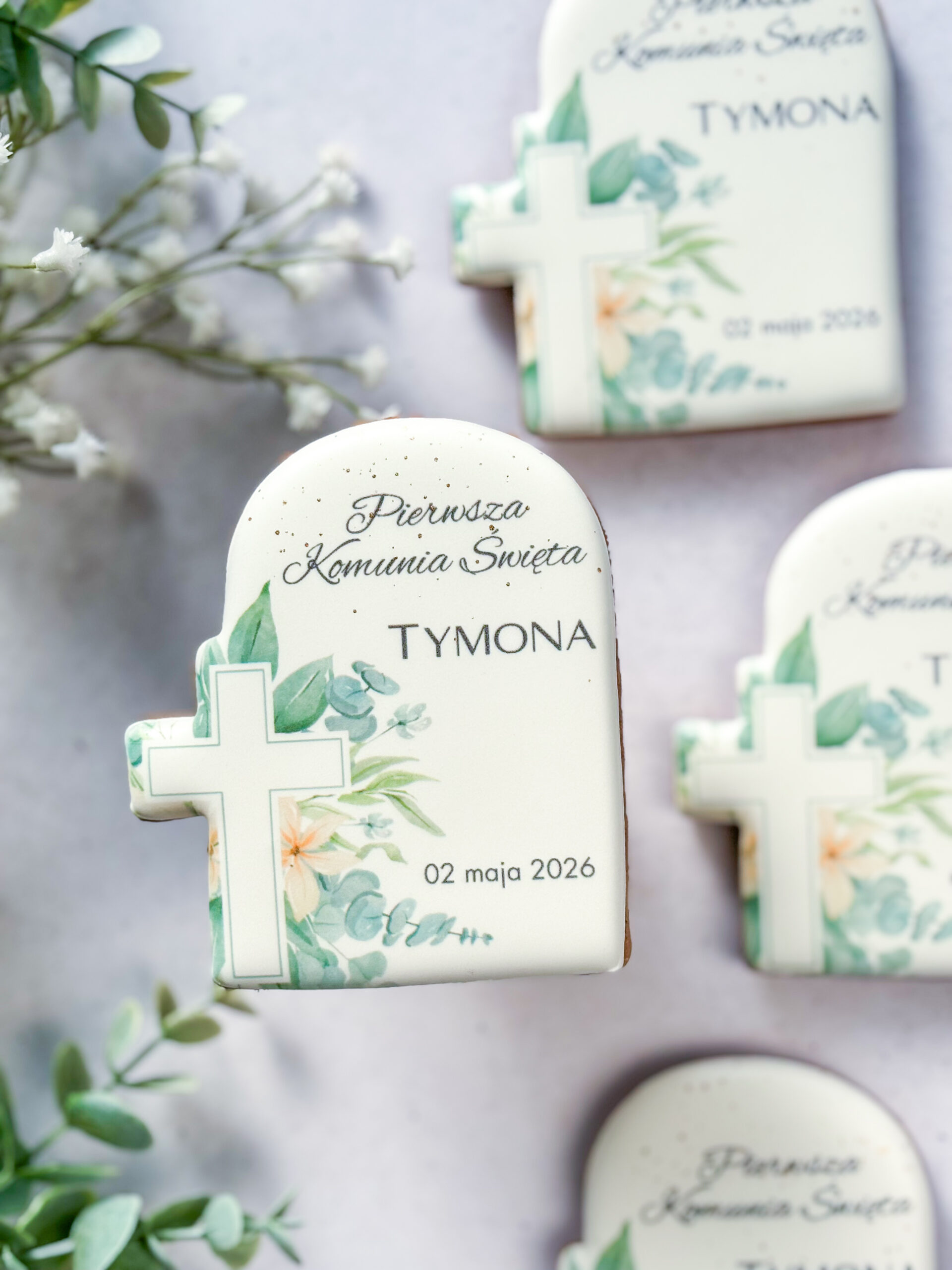 Personalizowany piernik z krzyżykiem to wyjątkowy upominek na Pierwszą Komunię Świętą lub Chrzciny / Chrzest Święty. Elegancki kształt, subtelna roślinna grafika oraz możliwość dodania imienia dziecka i daty uroczystości sprawiają, że jest to piękna i symboliczna słodkość na ważne rodzinne wydarzenie.