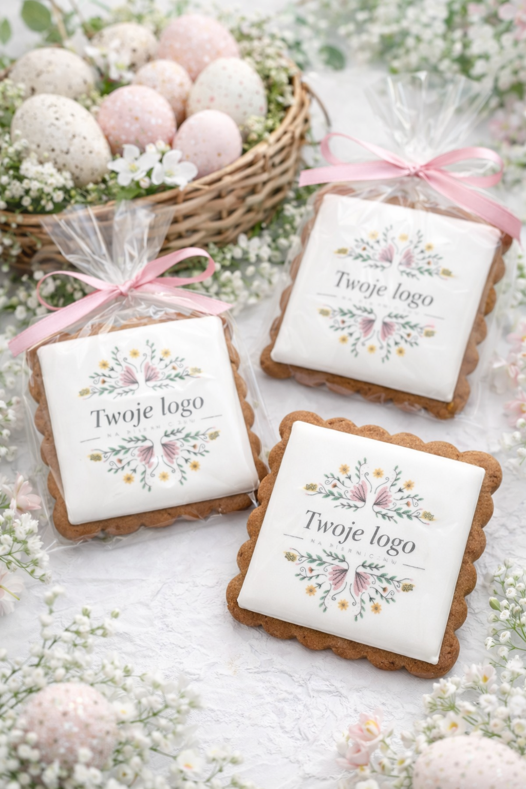Elegancki piernik wielkanocny z jadalnym nadrukiem logo firmy. Ręcznie dekorowane ciastko w klasycznym kwadratowym kształcie – idealny upominek firmowy na Wielkanoc dla klientów i pracowników.