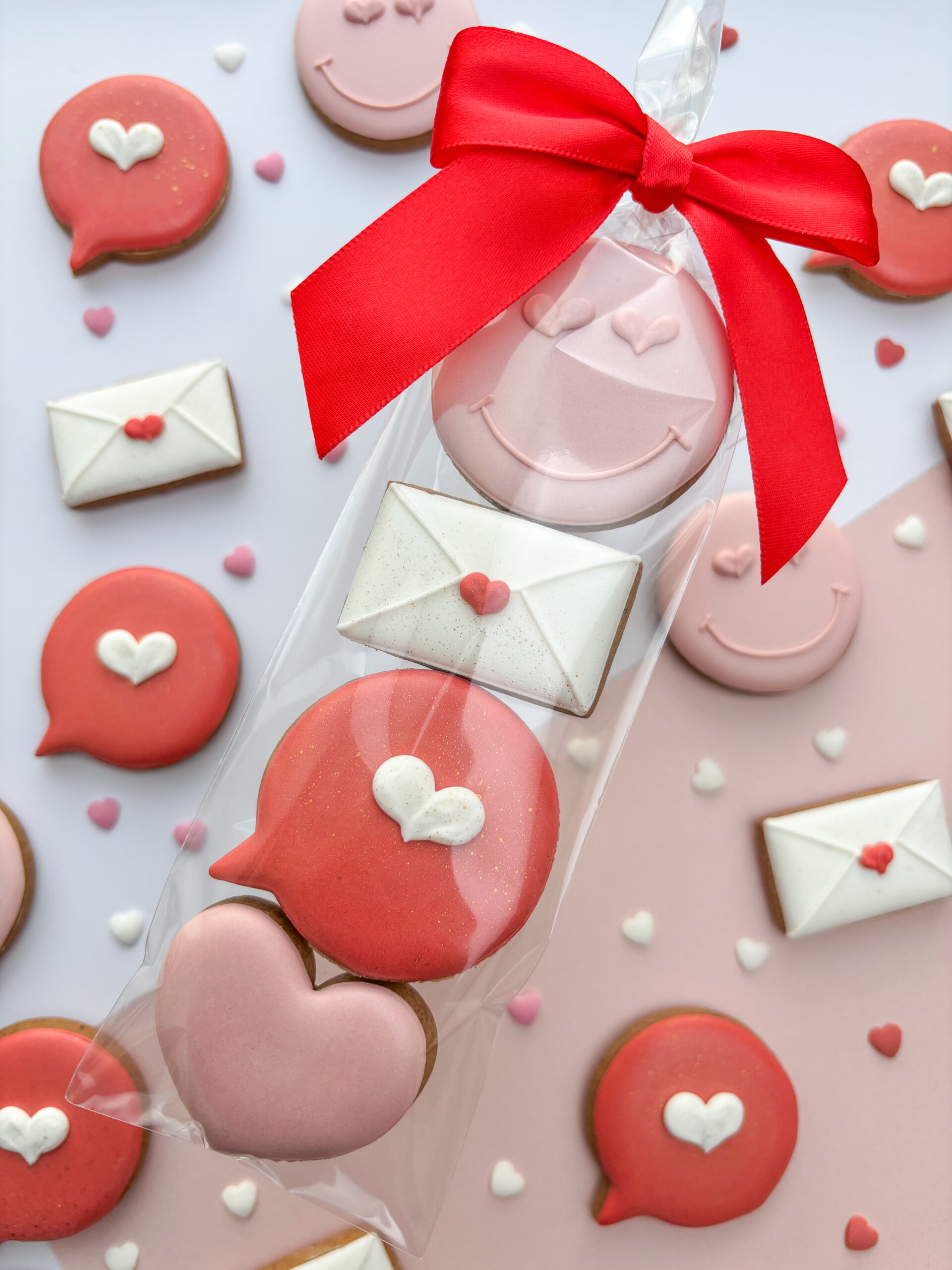 Zestaw 4 ręcznie lukrowanych mini pierniczków w walentynkowych kształtach: serce, koperta i motywy miłosne. Starannie zapakowane w celofan z czerwoną wstążką – gotowe do wręczenia jako słodki prezent na Walentynki. Idealne dla ukochanej osoby, ale także jako drobny upominek firmowy dla klientów lub zespołu.