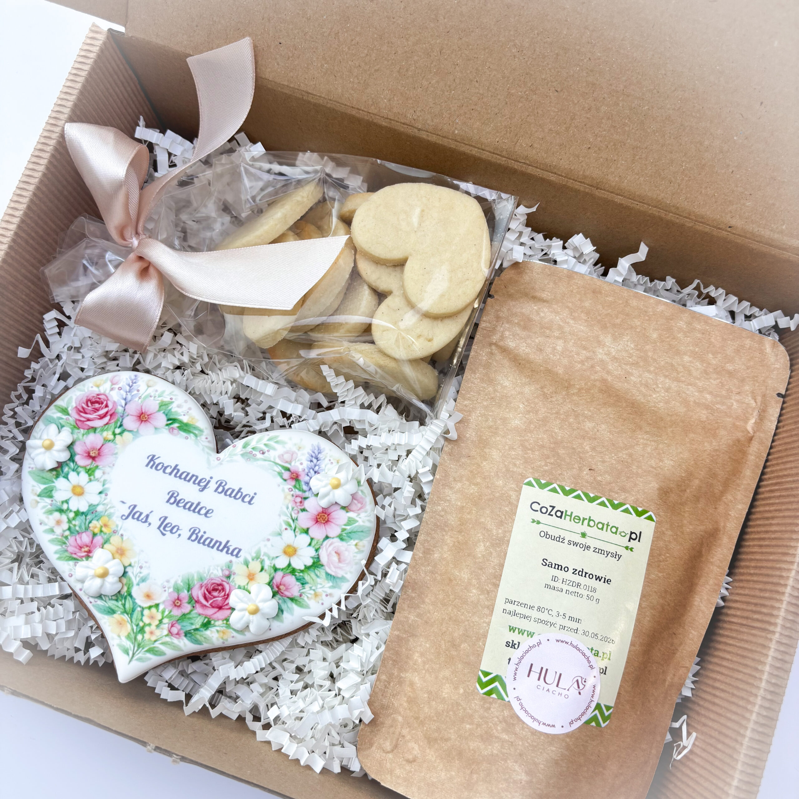 Zestaw premium na Dzień Babci i Dziadka to elegancki i pełen ciepła prezent, stworzony z myślą o wyjątkowych osobach. W estetycznym pudełku prezentowym znajduje się duży, ręcznie dekorowany piernik w kształcie serca z personalizowaną dedykacją, większa paczka naszych autorskich ciasteczek maślanych waniliowych oraz aromatyczna herbatka „Na zdrowie”.
